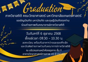 ขอเชิญบัณฑิต มหาบัณฑิต และดุษฎีบัณฑิตร่วยถ่ายภาพกับคณาจารย์ภาควิชาสถิติในวันที่ 6 ตุลาคม 2568
